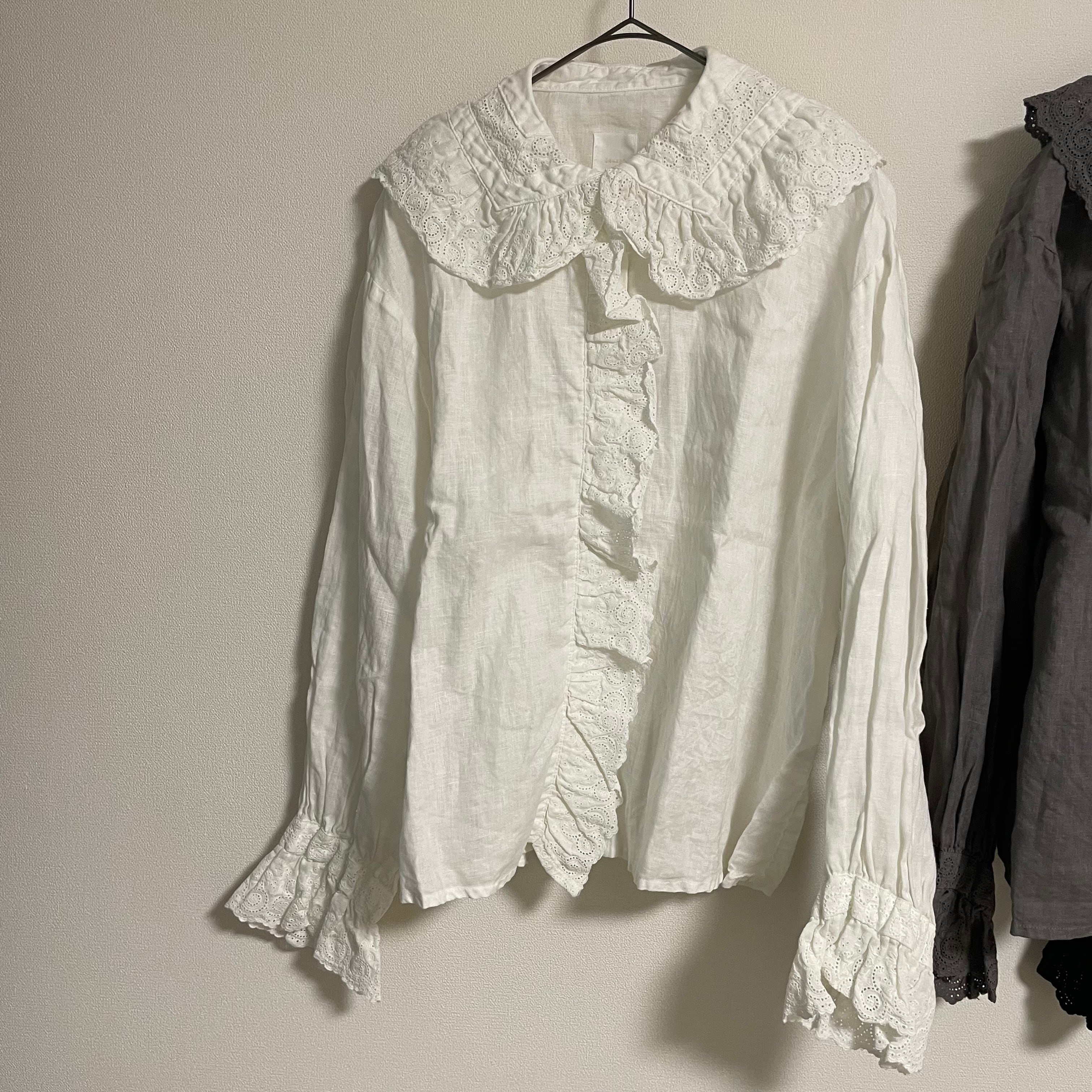 ⚠️GWおでかけ準備クーポンのご利用不可の商品です。ご了承ください。 Gauze#//ameri ANTIQUE FRILL BLOUSE/ ameriフリルブラウス/ G1160 ”ameri”という架空のおとぎの国の少女のワードローブ 復刻したアンティークレースを贅沢に使った一枚は、甘くなりすぎない大人のコーディネートが◎ 薄手のリネン素材で、ホワイトはやや透け感があります。 その他のcolorは、透け感は気にならないほどです。 --------------------------------------------- Colors: ROYAL WHITE. FADE GRAY. NOIR (ALL GARMENT DYL) Material: LINEN 100% Sizes: FREE Product: JAPAN 身幅:57cm 着丈:59cm (後ろ身頃真ん中) 裄丈:83 平置き採寸です。 多少の誤差、個体差はご了承ください。 ▼ お取り扱い上のご注意 ▼ ・この商品の素材は天然素材の為、ネップ(繊維の節、染めムラがある場合があります。 (ネップは織りキズではありませんのでご了承ください) ・素材の特性上、多少収縮する可能性があります。 ・製品染商品、または濃色製品に関しては、着用中の汗や摩擦によって色移りすることがあります。 その為、洗濯の際は他の物と一緒に洗わず、単独洗いをお勧めします。 また、洗濯後長時間濡れたままで重ねておくと移染のおそれがありますのですぐに形を整えて干してください。
