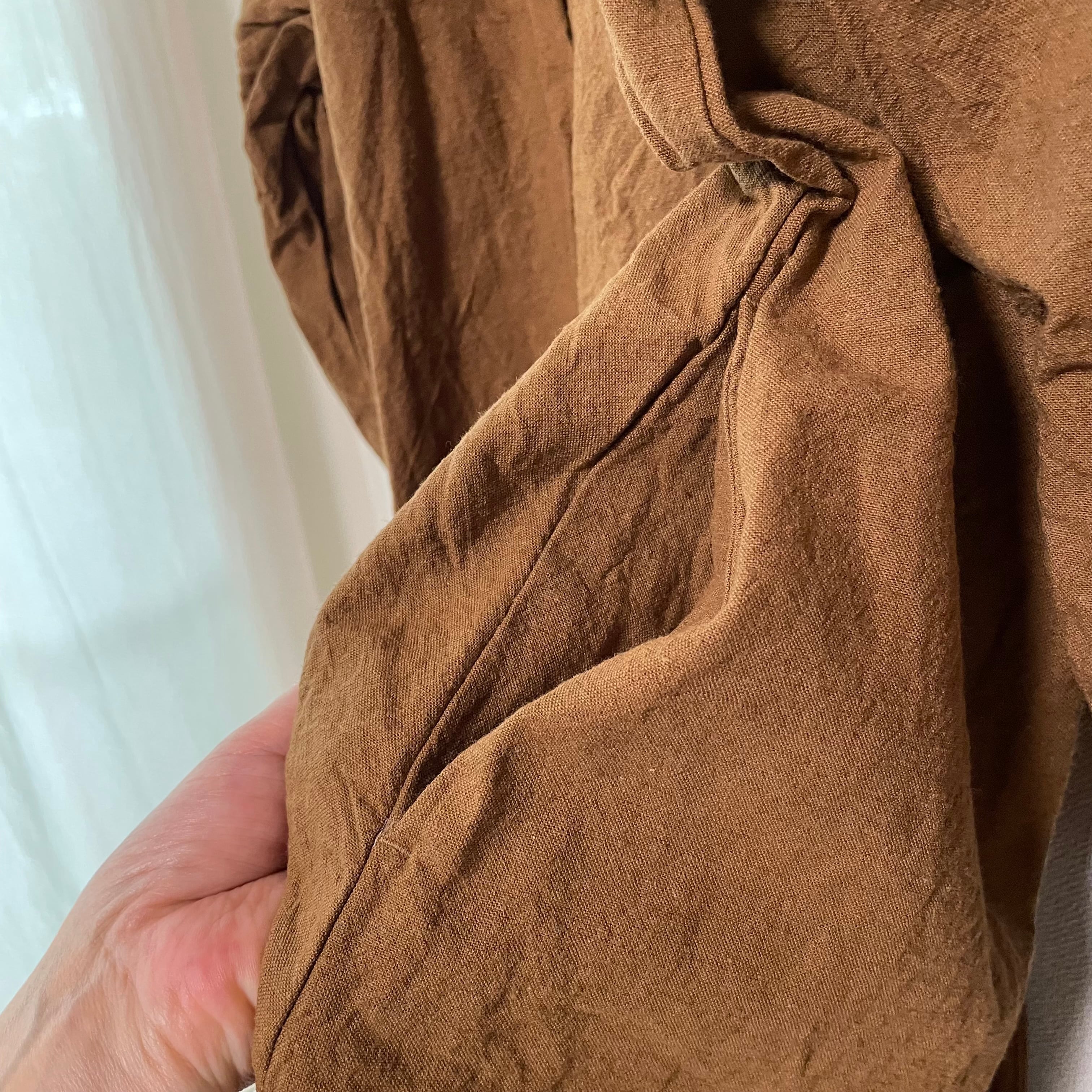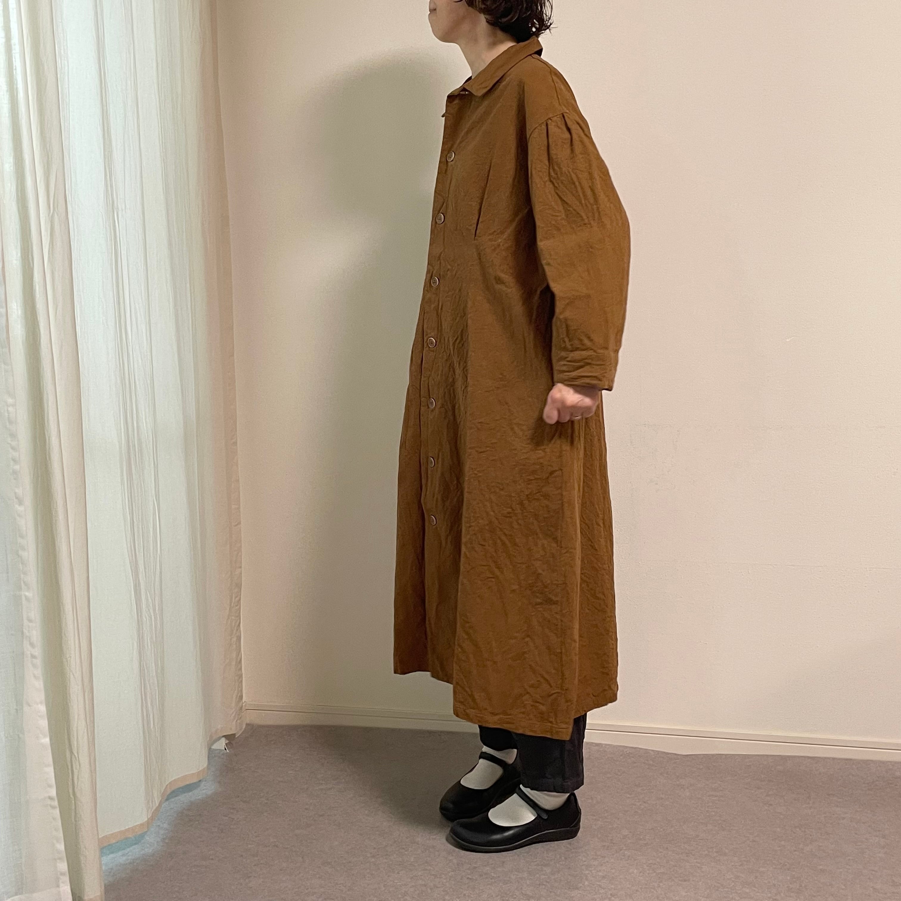 古布のような色合いと風合いを再現した生地のコートは女性画家をイメージ