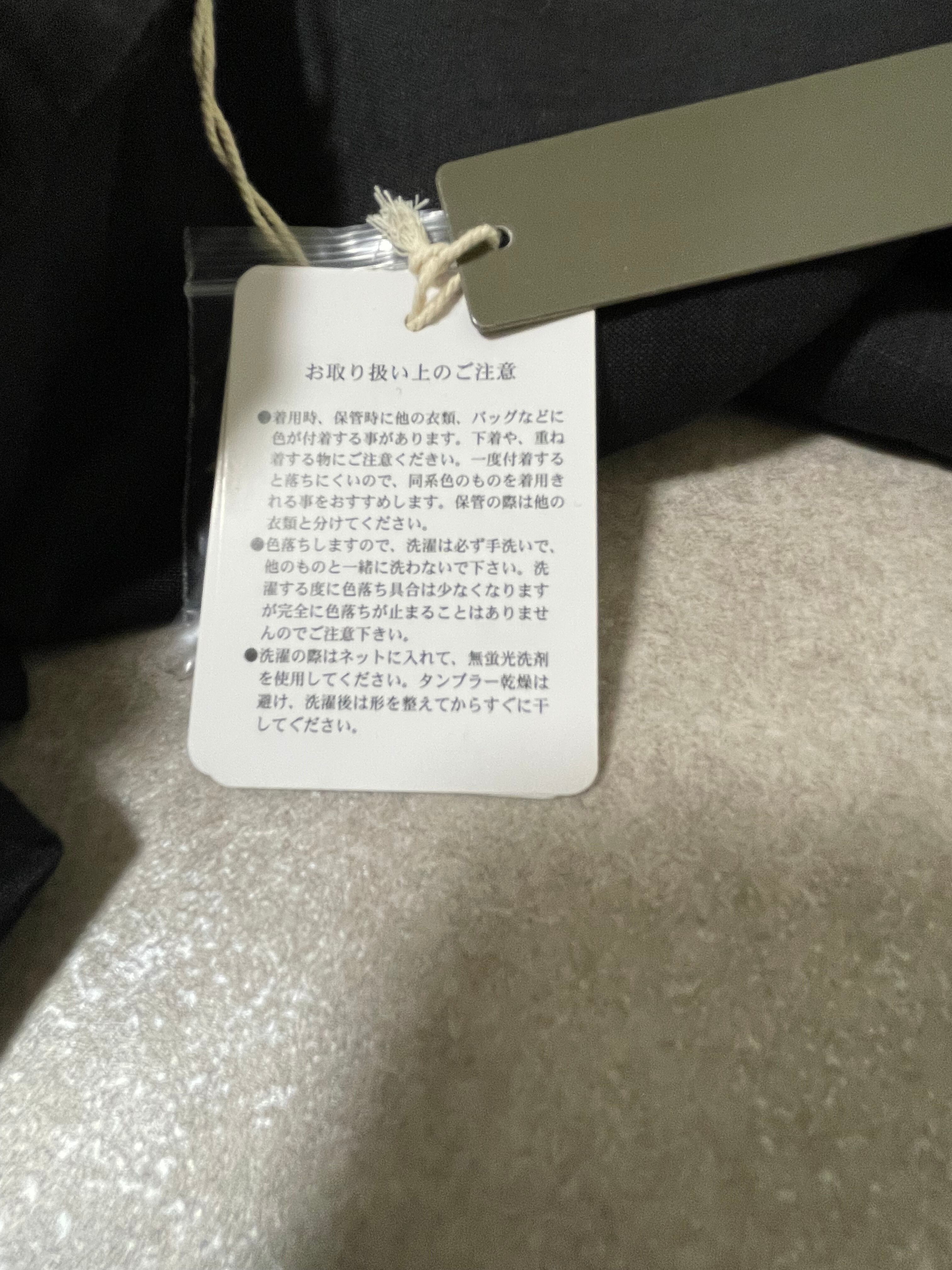 ・着用時、保管時に他の衣類、バッグなどに色が付着する事があります。下着や、重ね着する物にご注意ください。一度付着すると落ちにくいので、同系色のものを着用きれる事をおすすめします。保管の際は他の衣類と分けてください。