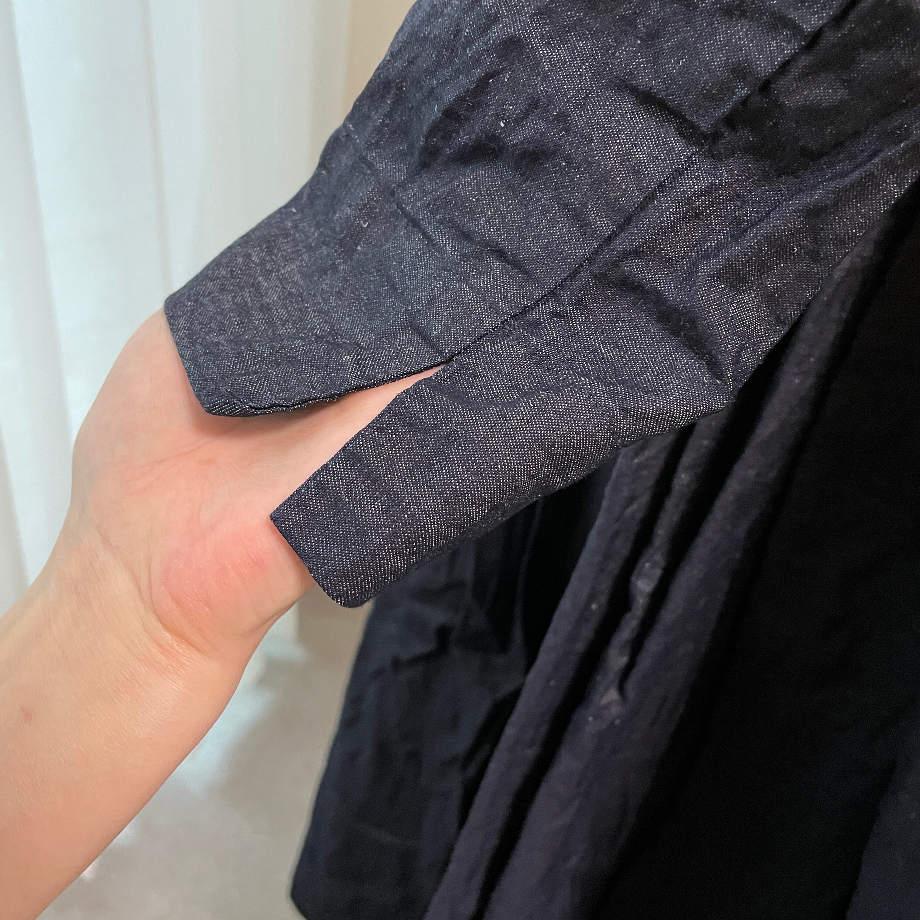 薄手で透け感のない軽やかなコットンリネンの素材。洗っていくうちに柔らかくなっていくインディゴ生地で、通年着用出来ておすすめです。